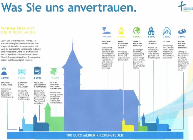 Sie zahlen Kirchensteuer oder Kirchgeld – wofür genau? Die Antwort gibt Ihnen „Was Sie uns anvertrauen“. So lautet der Titel einer neuen Broschüre. Darin zeigt Ihnen Ihre Evangelische Landeskirche in Baden auf anschauliche Weise, warum Ihr Beitrag so wichtig ist, wie vielfältig er eingesetzt wird und was er –auch in Ihrem Alltag - bewirkt.