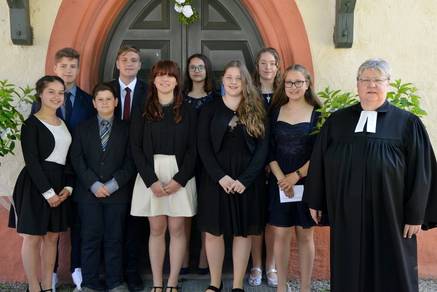 Michael Böhm, Noah Clemens, Lena Enderle, Diego Fistikci, Yannick Ghestern, Bastian Huber, Kai Hummel, Kevin Keuntje, Fabienne Körner, Emil Mannßhardt, Kaja Roß, Jonas Schank, Linus Schoch, Leoni Schwab, Maya Streit, Alina Vladar zusammen mit Pfarrerin Eichhorn und den Konfi-Teamern.