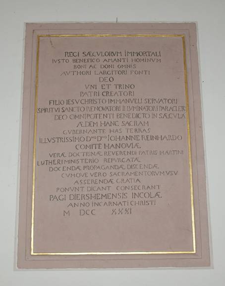 "Dem ewigen und unvergänglichen Könige, dem allein wahren und reichen Segner der Menschen, der unerschöpflichen Quelle jeder guten und vollkommenen Gabe, Gott dem Einen und Dreieinen, dem allmächtigen Schöpfer und Vater, dem Sohne Jesu Christo, unserem Seligmacher und Friedensfürsten, und dem heiligen Geist, dem Erneuerer, Erleuchter und Tröster, welchem sei Ehre in aller Heiligkeit, setzen, heiligen, weihen unter der Herrschaft des sehr geehrten und erlauchten Herrn, Herrn Johann Reinhard, Graf zu Hanau, diesen Tempel, daß darin die von D. Martin Luther gereinigte Lehre des Evangeliums geehrt, verbreitet, verkündigt und gelernt, sowie die heiligen Sakramente gefeieert werden. Die Einwohner des Ortes Diersheim im Jahre der Menschwerdung Christi 1731"