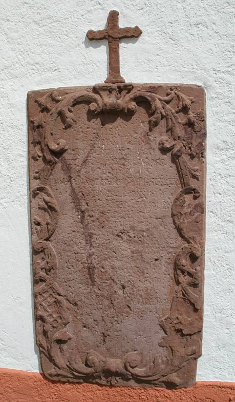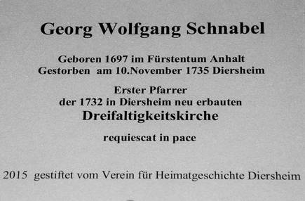 An der Westseite des Turms ist eine - leider heute kaum mehr leserliche - Sandsteintafel zu sehen. Genau genommen ist es keine Tafel sondern ein Grabstein. Er wurde für den ersten Diersheimer Pfarrer Georg Wolfgang Schnabel dort eingelassen. Bevor er am 2. Februar 1732 in Diersheim als Pfarrer in sein Amt eingeführt wurde, war er Diakonus in Lichtenau. Leider blieb er den Diersheimern nicht lange erhalten. Bereits drei Jahre nach seiner Amtseinführung starb er "an einer hitzigen Krankheit".