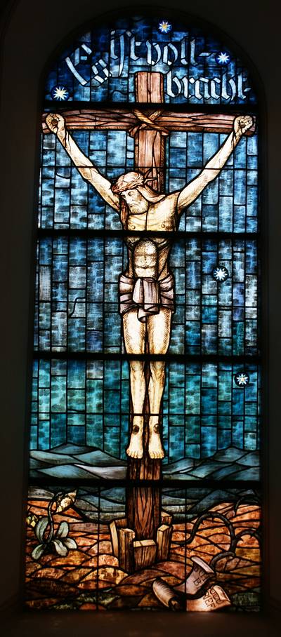 Über dem Kreuz stehen die Worte „Es ist vollbracht“. Diese waren nach dem Johannesevangelium die letzten Worte Jesu und sie unterstreichen sein erreichtes Ziel: die Menschen mit Gott zu versöhnen (Joh. 19, 30). Die überstandenen Schmerzen zeichnen das Gesicht des Gekreuzigten, der Gesichtsausdruck ist ernst und gelassen. Christus neigt sein Haupt nach rechts. Seine fast geschlossenen Augen sind auf eine Schlüsselblume gerichtet (links unten). Diese hat den Beinamen „Himmelsschlüssel“, mit ihm wird der Himmel an Ostern, dem Tag der Auferstehung von Jesus Christus und der Überwindung des Todes „aufgeschlossen“.